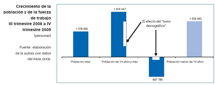 Del tercer trimestre de 2008 al cuarto de 2009, la población total aumentó en 1 millón de personas. Sin embargo, en el mismo lapso la población de 14 años y más creció casi el doble (1.9 millones de personas), al ingresar a la edad de trabajar una cohorte de jóvenes que nacieron en períodos en que el crecimiento demográfico era más alto y que hoy irrumpen como población potencialmente buscadora de trabajo. Por el contrario, la población infantil ya está decreciendo. En el mismo lapso, los menores de 14 años se redujeron en 838 mil personas, lo que significa menor presión en la demanda cuantitativa de escuelas primarias o de preescolar, menor necesidad de atención pediátrica, etcétera.