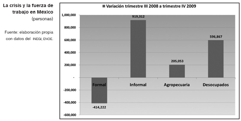 El empleo informal se disparó a raí0z de la crisis, aunque a un ritmo insuficiente para absorber a toda la mano de obra que requiere colocarse, tanto la desplazada del empleo formal, como la que recientemente se ha incorporado al mercado de trabajo. Entre el tercer trimestre de 2008 y el cuarto de 2009 se incorporaron a este sector aproximadamente 900 mil trabajadores para llegar a un total de casi 20 millones de personas, que ya rebasan a los ocupados en todos los sistemas del sector formal.