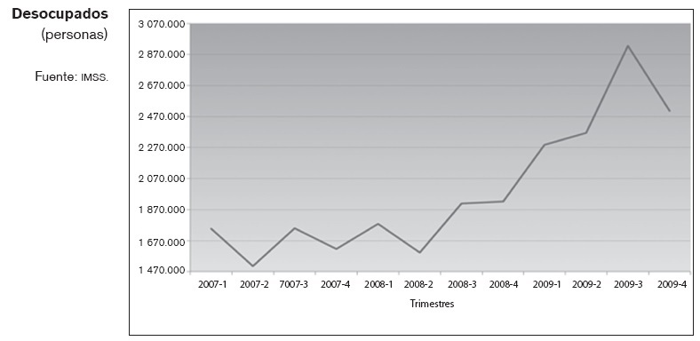 Un producto neto de la crisis que llama la atención es el salto abrupto que en México han tenido los indicadores de desocupación que hasta ahora habían sido atípicamente bajos, en razón de la existencia de las otras "válvulas tradicionales de salida" del mercado de trabajo mexicano. Como lo reflejan las cifras del INEGI, del tercer trimestre de 2008 al cuarto de 2009 la desocupación pasó de 1.9 a 2.5 millones de trabajadores, un incremento que representa 31 por ciento.