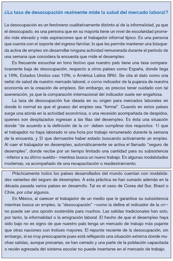 Estos escapes, particularmente el alto volumen de emigración de fuerza de trabajo, que por su magnitud, difiere de la situación de otros países tanto desarrollados como en desarrollo, explicaban el hasta hace algunos meses atípicamente "bajo" desempleo abierto. Otra razón, no menos importante, es que ante la falta de protección económica al desempleo, ésta no es una opción viable para muchos trabajadores, que ante el apremio de la falta de trabajo, buscan cualquier actividad en la informalidad. Queda claro entonces que tasas de desempleo comparativamente bajas dentro del contexto internacional, no refleja una situación más favorable y constituyen un indicador engañoso de la salud del mercado laboral.
