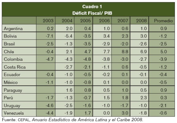 Argentina ha mantenido desde 2003 un superávit fiscal promedio cercano a un punto de su producto; Bolivia, desde la llegada de Evo Morales el déficit fiscal se convirtió en superávit; Chile, salvo en 2003, ha tenido un superávit equivalente a seis puntos del PIB; Ecuador ha equilibrado sus cuentas fiscales; incluso Venezuela ha tenido un déficit promedio de 0.6% de su PIB; sólo Brasil y Uruguay han mantenido en casi en todos los años situaciones ligeramente deficitarias. En Colombia, Costa Rica, México y Perú, sólo el primero ha tenido un déficit promedio alto (3.9% del PIB).