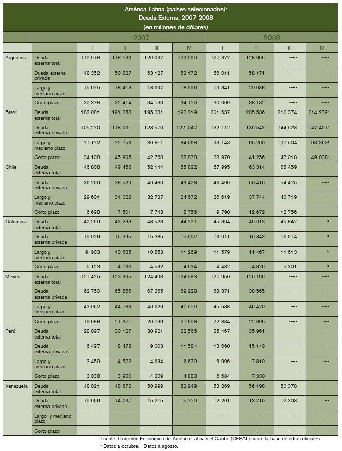 En Argentina, en el primer trimestre de 2007 la deuda privada era 43% de la deuda externa, de la cual 67% era a corto plazo; en el segundo trimestre de 2008 la proporción de la deuda privada en el total pasó a 45% y los compromisos de corto plazo se mantuvieron en las dos terceras partes. En Brasil la deuda externa privada representaba 58% en el primer período y crece hasta 66% en el último, en tanto en Chile el dato es cercano a 80% y en México se ubica ligeramente por encima de 50%. La reducción de la deuda pública externa ha permitido incrementar el gasto público para fines sociales y de promoción económica sin que afecte las finanzas públicas, ya que se han contraído los pagos de capital e intereses a los acreedores externos.