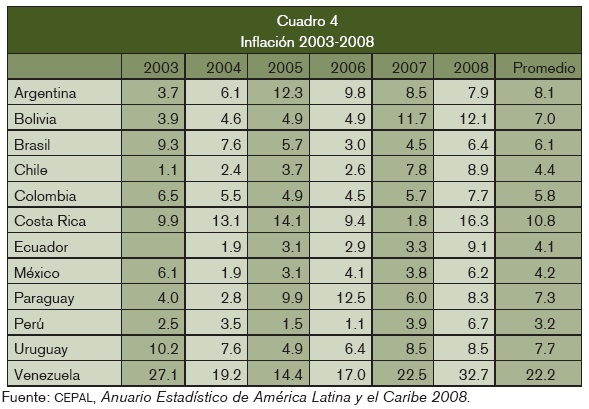 En relación con la inflación en los años 2003-2008 (ver el cuadro 4) los resultados de los países seleccionados, con la excepción de Venezuela, son muy cercanos y dan cuenta de una preocupación por mantener controlada esta variable. En ese propósito no parece que las diferencias ideológicas entre los equipos gobernantes hayan implicado consideraciones distintas de política monetaria y crediticia. Lo que importa distinguir es la situación de los bancos centrales.22