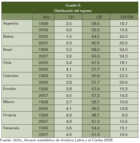 En términos internacionales la mejor distribución del ingreso es la de Corea y los países escandinavos que tienen un indicador Q5/Q1 de un poco más de seis veces; otra medida internacionalmente comparable es la participación del Q1 en el ingreso nacional (World Bank, 2009). Los países con mejor situación son: Japón (10.6), República Checa (10.3), Noruega (9.6) y Suecia (9.1); la comparación con los países de la región, como se aprecia en la segunda columna del cuadro 5 (Q1), indica que la concentración del ingreso en América Latina sigue siendo muy alta, pero justamente el desafío abierto por la llegada de gobiernos de izquierdas ha provocado una mejoría significativa.