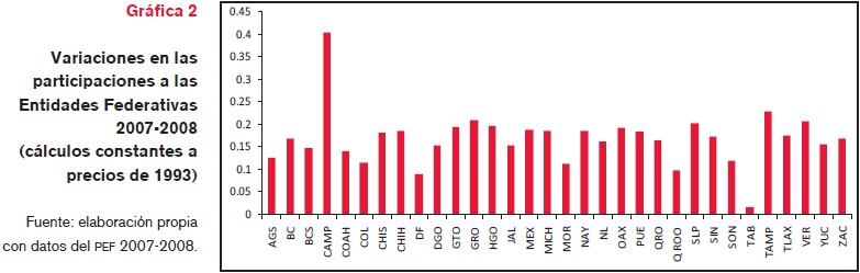 El beneficio para las entidades federativas a partir de la reforma a la LCF a nivel presupuestal es notorio. De 2006 a 2007 los gastos presupuestales, en términos reales a precio de 1993, tuvieron un incremento de 9.52% de acuerdo con los Presupuestos de Egresos de la Federación (PEF) correspondientes, mientras que las participaciones a las entidades federativas tan sólo se incrementaron en promedio en 7%. El comportamiento para el periodo de 2007-2008 denotaba un incremento de 6.59% en el gasto presupuestal y de 16.74% en promedio para las participaciones a las entidades federativas (gráfica 2). Situación que mejoró la condición de recursos en todas las entidades con excepción del Distrito Federal y de Quintana Roo.