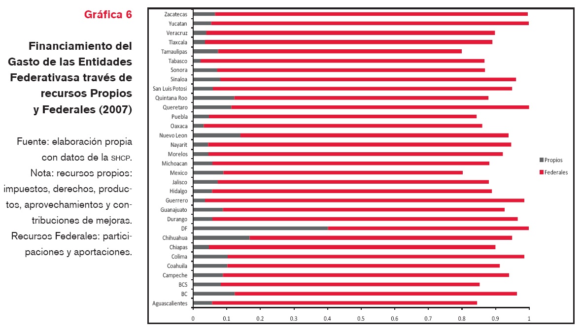 En materia de ingresos la Federación, como ya se comentó, al establecer el Sistema Nacional de Coordinación Fiscal (SNCF) se hace cargo de los dos impuestos de base amplia más relevantes como lo son: el Impuestos Sobre la Renta (ISR) y el Impuesto al Valor Agregado (IVA), estos dos gravámenes le reproducen al Estado cerca de 9% del producto interno bruto; si se tiene en cuenta que los ingresos tributarios no van más allá de 12% del PIB lo anterior resulta altamente ilustrativo. La centralización del ingreso por parte de la Federación conlleva una dependencia de ingresos de los gobiernos locales por los recursos de la Federación, siendo en algunos casos que dichos recursos constituyen más del 90% de los ingresos con los que cuentan, tal es el caso de Durango, Guerrero, Nayarit, Yucatán y Zacatecas en 2007 (gráfica 6).