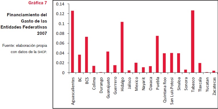 En 2007 Estados como: Chiapas, Guerrero, Morelos, Nayarit, Oaxaca, Puebla, Tabasco, Tlaxcala y Veracruz ni siquiera lograron ingresos propios mayores a 5% de los gastos en los que incurrieron en ese ejercicio, situación que los coloca en una amplia dependencia de los recursos federales, mismos que en una cuantía importante son recursos condicionados. La escasez de recursos propios o de la Federación en algunos casos obliga a los Estados a financiar su gasto mediante deuda pública como fue la saturación de los que se presentan en la gráfica 7.