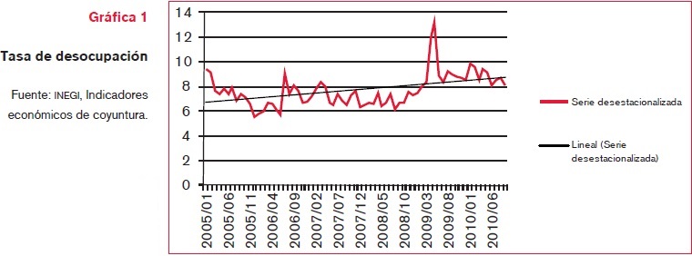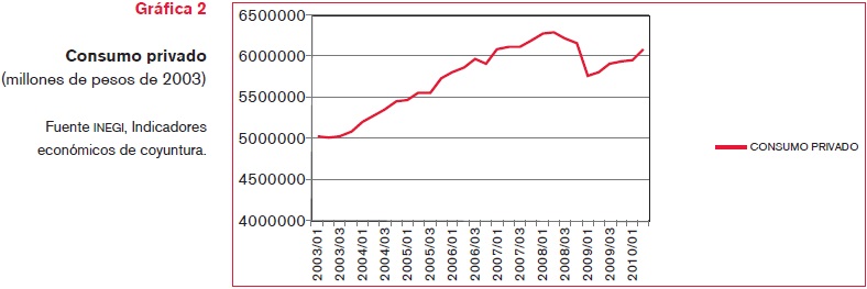 México no está exento de esta situación, el Banco de México ha mantenido por 16 meses consecutivos su tasa de referencia en 4.5% y sin embargo el crédito bancario y la inversión productiva se mantienen estancados, en tanto que el consumo interno no muestra signos de recuperación sostenida, la tasa de desempleo se mantiene en niveles elevados y con una clara tendencia al alza al igual que la tasa de subocupación (gráfica 1) en tanto que el consumo privado no logra retornar a los niveles previos a la crisis (gráfica 2), y la inversión fija bruta se encuentra sumamente deprimida (gráfica 3).
