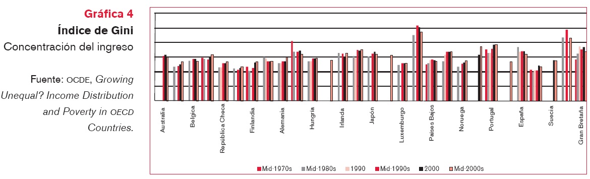 A nivel de los países miembros de la OCDE, se observa una clara tendencia a la concentración del ingreso y la riqueza. En tres de cada cuatro países se ha incrementado la brecha entre ricos y pobres, siendo los más afectados Canadá, Alemania, Italia, Estados Unidos y Noruega. En aquellos países en que había más equidad, la pobreza se ha extendido en materia de ingresos y la movilidad social se ha reducido, siendo los más afectados los jóvenes y los niños que tienen ahora 25% más de probabilidad de ser pobres a pesar de que se han incrementado los gastos en beneficios sociales y los impuestos para compensar la desigualdad (gráfica 4). Un estudio de la OCDE muestra que los cambios en la estructura de la población y el mercado laboral han contribuido enormemente a este aumento de la desigualdad (Organización para la Cooperación Económica y el Desarrollo, 2008).