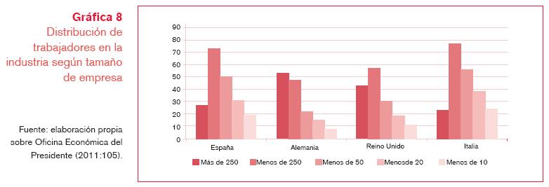 Aquí radica uno de los límites más importantes al avance de la competitividad española, la existencia de un tejido empresarial con escasa vocación innovadora, vinculado a una estructura minifundista. Como se puede observar en la gráfica 8, la empresa industrial española con más de 250 trabajadores en plantilla acumula poco más del 25% del total del empleo en el sector, cifras que le sitúan en el entorno de Italia, pero lejos de Reino Unido, que muestra cifras de 40% y más lejos aún de Alemania, con más de 50 por ciento.