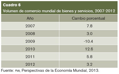 Muchos países plantean crecer hacia fuera para contrarrestar la restricción del mercado interno que generan las políticas de austeridad fiscal, el alto desempleo, y los bajos salarios, así como para disminuir el déficit de comercio exterior y obtener divisas para el pago de su deuda. Al no poder devaluar muchos de ellos, ya sea porque trabajan con moneda única caso de los países de la zona euro, como aquellos que priorizan la estabilidad cambiaria a favor del sector financiero, están procediendo a reducir salarios para mejorar competitividad. Sin embargo, no pueden sustentar una estrategia de desarrollo a través de reducir salarios e incrementar la pobreza, pues ello restringe sus mercados internos, que son los mercados externos de los otros. A ello se suma la generalización de las políticas de austeridad fiscal que contraen el mercado interno, que es el mercado externo de su vecino, situación que mantiene contraído el comercio exterior (véase cuadro 6), lo que recrudece la competencia entre países, lo que hace más difícil tener éxito en dicha estrategia.