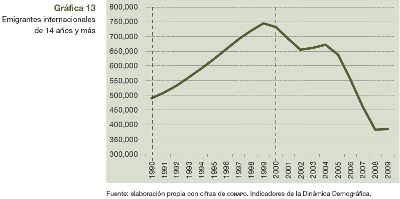 La emigración laboral, que se había intensificado en el segundo decenio de los noventa ante la caída del empleo en el campo, se vio notoriamente frenada a partir del 2000, a raíz tanto de las recesiones en Estados Unidos, como de nuevas políticas de ese país en torno a los migrantes. La caída de la ocupación en las manufacturas en los 2000 y el cierre de las vías para la emigración laboral retroalimentaron el crecimiento de la informalidad que de 2005 a 2012 se incrementó en más de 4 millones de personas (INEGI, ENOE).