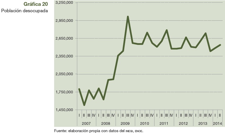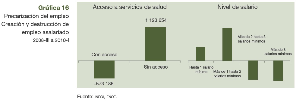 Mientras que las ocupaciones con acceso a seguridad social disminuyeron en 573 mil personas entre el tercer trimestre de 2008 y el primero de 2010, el grueso de las ocupaciones que se generaron en ese lapso, carecían de todo tipo de seguridad social. Es decir, es empleo asalariado precario. Todavía en 2014 la tendencia a la precarización del empleo asalariado persiste. Los puestos de trabajo creados desde fines de 2008 son mayoritariamente de bajo salario, en tanto que los de más de 3 salarios mínimos han seguido cayendo. De acuerdo a la ENOE, en el primer trimestre de 2014, el número de empleos de más de 3 salarios mínimos era 1 millón y medio inferior al registrado más de 5 años de iniciada la crisis, en el tercer trimestre de 2008.