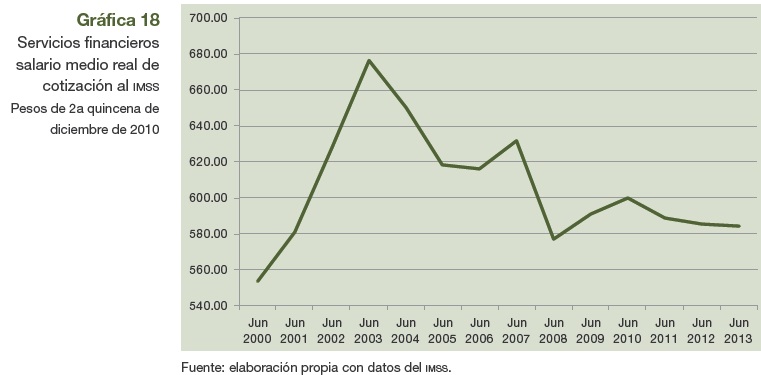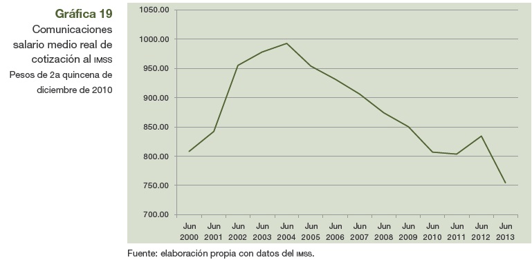 La compresión salarial ha sido particularmente notoria en las ramas que empleaban personal más calificado y tradicionalmente ofrecían salarios más elevados dentro del sector formal, como son las comunicaciones y los servicios financieros. En ambas es claro el descenso observado en el salario medio real de cotización al IMSS en los últimos diez años. Esta situación es producto, tanto de una moderación en los incrementos salariales anuales, como de la práctica cada vez más extendida en estos sectores de la subcontratación de una parte importante de su plantilla.