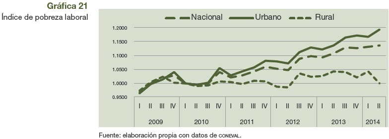 La estimación más reciente de este fenómeno -que atiende a los nuevos criterios emitidos por la OIT- y con base en series homogéneas de INEGI que consideran la informalidad rural y urbana, permite apreciar un crecimiento sostenido de este fenómeno desde 2005 en que se dispone de esta nueva estadística. En este lapso la informalidad se eleva en cerca de cuatro millones y en 2014 representa 58% de la población ocupada.