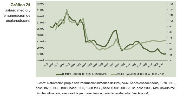 En México, como en otros países en desarrollo, desde que existen las cuentas nacionales las remuneraciones al trabajo asalariado han representado una proporción muy inferior dentro del ingreso nacional, a la que corresponde a los ingresos combinados de otras fuentes. Desde los años setenta esta proporción ha representado entre 30 y 40% del PIB, en tanto que a otras fuentes ha correspondido entre 60-70% restante. Éste patrón distributivo difiere marcadamente del observado en las economías más avanzadas, donde las proporciones prácticamente se invierten, como se observa en las siguientes gráficas:
