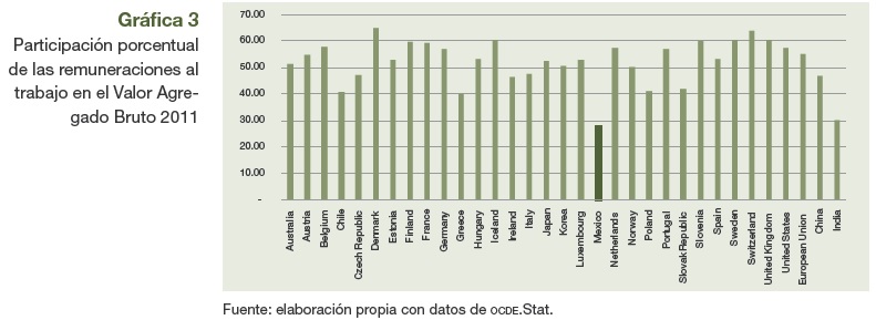 A nivel internacional, la proporción de las remuneraciones al trabajo asalariado en el valor agregado -sin considerar los ingresos mixtos- era en México en 2012 la más baja entre 31 países incluidos en la base de datos de la OCDE,1 que incluía a algunos países no miembros. Era casi 10 puntos porcentuales inferior a las de Chile o Grecia y cerca de 18 puntos más baja que la de China, como puede observarse en la gráfica siguiente.