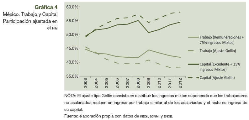A partir del monto de los ingresos mixtos, es posible efectuar un ajuste a fin de tener una idea más precisa de la participación del trabajo y del capital en el PIB. A las remuneraciones de los asalariados se les agrega una parte de los ingresos mixtos y el resto se suma al excedente de operación. Suponiendo que 75% los ingresos mixtos en México fuese atribuible al trabajo y 25% al capital, la participación total del trabajo dentro del PIB no rebasaría 50% de dicho agregado (línea verde contínua).
