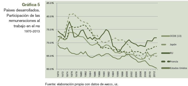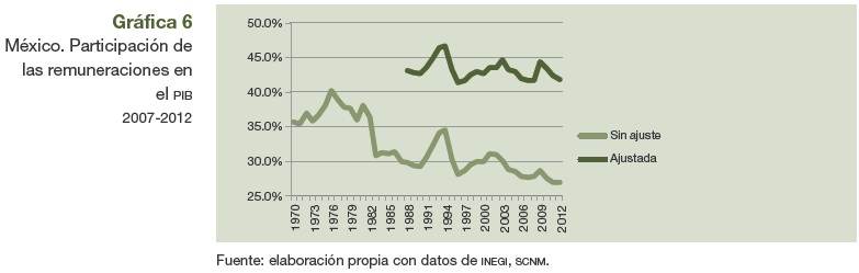 Una tendencia que ha llamado la atención a nivel mundial es que, a partir de los años setenta, se observa una declinación en la participación de los salarios en el ingreso nacional en la gran mayoría de los países, aún si se elimina el efecto de los ciclos económicos. Este comportamiento -que ha sido abordado por distintos organismos internacionales-4 es muy evidente en las naciones más avanzadas de la OCDE, en donde los salarios, que en la década de los setenta se ubicaban entre 70 y 80% del ingreso nacional, han bajado hasta niveles cercanos a 65% en 2010. El caso de México es más extremo, ya que de una proporción que ya era baja en los años setenta, ha descendido aún más (27.0% en 2012 y 41.8% si se ajusta por ingresos mixtos).