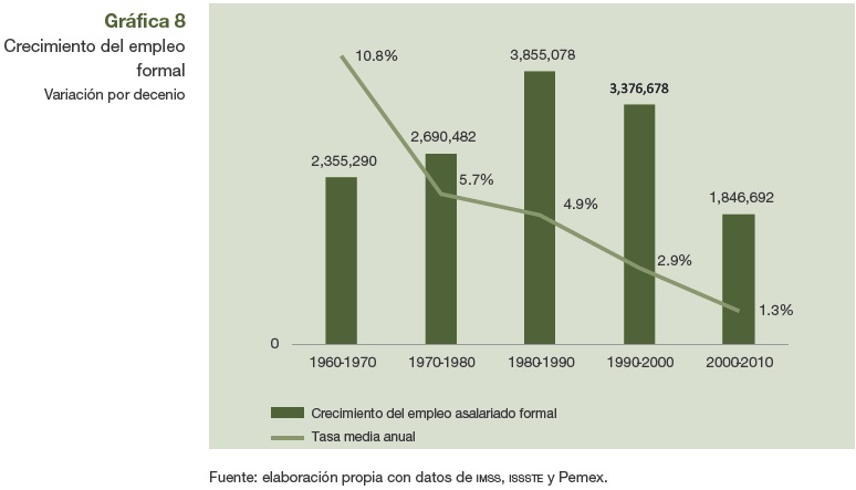 La debilidad en la creación de empleo formal se puede apreciar en la siguiente gráfica, en la que se muestra el número neto de nuevos empleos asalariados formales creados por década, con base en los registros los registros del IMSS, del ISSSTE y de Pemex. En comparación con los 3.9 millones de nuevos empleos formales netos generados en la década de los ochenta, en el primer decenio de este siglo solo pudieron crearse 1.8 millones de nuevos empleos formales.