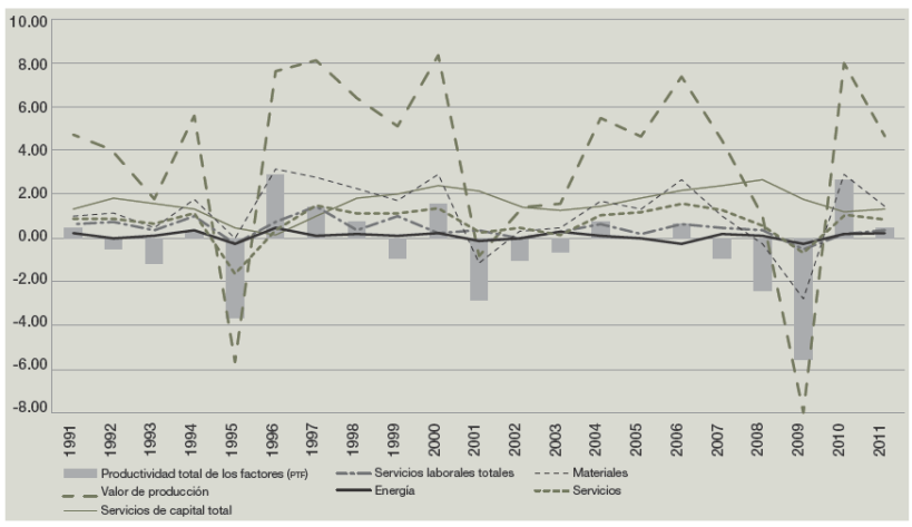 En la gráfica 1, que presenta el crecimiento anual del VP y las contribuciones al crecimiento económico de los factores productivos e insumos intermedios del modelo EU klems, la línea punteada, referida al VP, muestra un crecimiento promedio de 3.58%, con oscilaciones en la parte superior de 5% a 8% entre 1996-2000 contrarrestadas con caídas de casi -6% en 1995 y -8% en 2009. Los componentes del crecimiento que mayor peso tuvieron fueron K, M y S. Existe una correlación de casi 0.65 entre el crecimiento del VP y la PTF: los años de mayor crecimiento de la primera coinciden con las mayores alzas de la segunda (1996, 1997, 2000, 2004, 2006 y 2010), y los de mayor retroceso del PIB con los de mayor descenso de la PTF (1993, 1995, 1999, 2008 y 2009). La SHCP manifiesta que la relación de causalidad va del crecimiento de la productividad al del PIB (ΔPvd → ΔPIB). Empero, es evidente que la dependencia puede ser también en sentido contrario. Partamos de la siguiente función producción expresada en variaciones anuales: