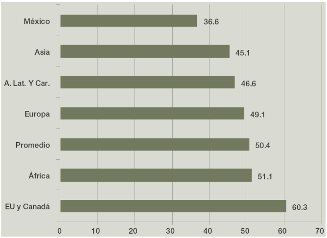 Otra evidencia del problema es la reducida participación de la masa salarial (sueldos, salarios y prestaciones) en el PIB, la cual pasó de 42.5% en 1981 a 27% en 2012 (Gutiérrez, 2013a: 59-60; INEGI, 2013b: 2). Y aunque no es tan baja cuando se parte de PWT (2014), cuya metodología estandariza los datos para hacerlos comparables internacionalmente, agregando a las percepciones las transferencias gubernamentales, se encuentra entre las menores del mundo, con 36.6% en 2011, muy inferior al promedio por regiones de los 125 países disponibles para este dato: 50.4%. Asimismo es menor al valor de cada una de las cinco regiones reportadas en la gráfica 11, incluyendo América Latina y el Caribe (46.6%). Varias economías emergentes no incluidas tienen valores más altos: Hungría, 61.2%; Brasil, 55.8%; República de Corea, 54.6%; Malasia, 53.1%; India, 48.6%; Chile, 44.7%; China, 41.9%.