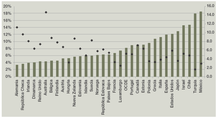 Cifras de la OCDE (2014) muestran que entre la población asalariada de nuestro país se encuentra el mayor porcentaje de pobres de los países miembros de esa organización: un poco más de 18.2%, cifra ligeramente superior a la de Turquía (18%), en tanto el promedio de la OCDE se sitúa en 8% (los valores se leen con las barras y la graduación del eje izquierdo de la gráfica 13). Adicionalmente, los rombos oscuros, que se refieren a la relación tasas de pobreza de jefes de familia sin trabajo/jefes de familia con trabajo, muestran niveles entre 2 y 4 para Turquía y México, y entre 14 y 18 para Alemania y Australia (su lectura se lleva a cabo en la escala derecha): en general, las familias de países con mayor pobreza laboral tienen mucho menos posibilidades de mejorar sus ingresos y salir de la pobreza.