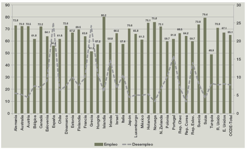 Gráfica 14 Tasas de empleo y desempleo normalizadas en países de la OCDE, 2012 (%)