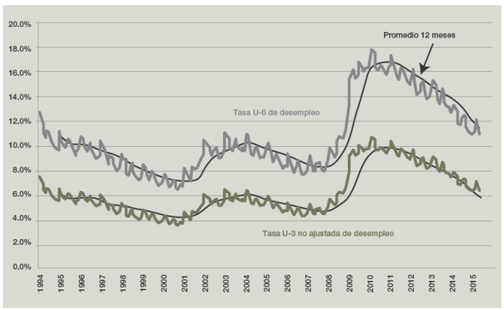 Un termómetro adicional del mercado laboral, desarrollado en Estados Unidos, es la Tasa Ampliada de Desempleo U6, que refleja las condiciones de presión a que se enfrenta el mercado de mano de obra y que por sus limitaciones conceptuales y de flexibilidad no detecta la tda (en algunos países se exageran niveles de desempleo muy bajos, sin que esto se pueda demostrar por falta de estadísticas adicionales, como las de solicitantes del seguro de desempleo). La U6 resulta de sumar la tda, o tasa U3, más la Tasa de Trabajadores Desalentados (TDES), más la Tasa de Trabajadores Involuntarios a Tiempo Parcial (TITP); es decir U6=TDA+TDES+TITP. Como muestra la gráfica 15, esta tasa y la tda muestran tendencias similares en dicho país, pero entre ambas hay una diferencia que se amplifica en periodos de alta presión para el mercado laboral (2009-2011), llegando hasta ocho puntos, y se reduce hasta menos de seis puntos en los de menor presión (fines de 2014-principios de 2015). Las cifras correspondientes a marzo de 2015 muestran que la tda se ubicó en 5.5% y la U6 en 10.9%.
