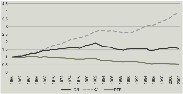 Gráfica 5 México: productividad de la mano de obra (Q/L), intensidad de capital (KL), y PTF, 1960-2002 (Índice 1960 = 1)