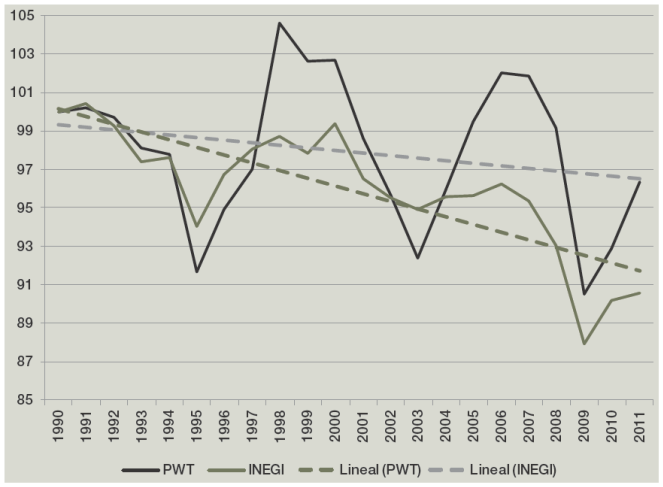 El tipo de medición de la PTF que lleva a cabo el INEGI a partir de 2013, basado en la metodología eu klems, entraña problemas de comparación con la serie obtenida a partir del método que la mayoría de analistas había usado hasta 2012 (ΔA/A = ΔY/Y - αΔK/K - βΔL/L), basado en Solow (1957), y que se obtiene de despejar ΔA/A, o PTF, de la ecuación (1). Para visualizar esto, en la gráfica 6 se comparan los resultados del INEGI con los de Penn Word Table (PWT, 2014), una base de datos a escala mundial que desglosa, año por año, las principales variables de contabilidad nacional y desarrollo económico de un grupo de más de 120 países. Para tal efecto, se cambia el año base de PWT a 1990 y las tasas de crecimiento de la serie del INEGI se ajustan a un índice base 1990, evidenciándose que los cálculos del INEGI suavizan la caída de la PTF. La diferencia entre ambas es considerable de 1998 a 2000 (el índice de PWT supera al del INEGI entre 3.3 y 5.9 puntos porcentuales), así como en 2005-2011 (PWT supera a INEGI entre 2.6 y 6.5 puntos). En términos de crecimiento promedio, la caída de la PTF, que se expresa en las líneas de tendencia rectas, es -0.17% para PWT y -0.46% para el INEGI.