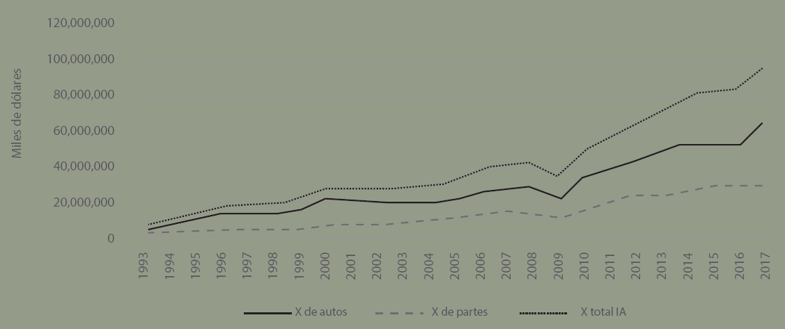 En sus inicios la producción de vehículos se orientó al mercado interno pero rápidamente fue virando hacia el mercado externo. Con la puesta en marcha del TLCAN se experimentó un giro determinante en tal dirección con una tasa de crecimiento media anual de la exportación automotriz de 10.7%, muy superior al crecimiento de 7.2% de la IA. Así de 7,208 miles de millones de dólares de exportaciones en 1993 se llegó a 43,069,292 MMD en 2007, un aumento de 614%. Posterior a la GR, el sector entra en una acelerada dinámica de exportación que eleva su monto a 96,866,024 MMD en 2017, lo que significa que este sector respondió por 25.3% de las exportaciones totales de México, de las cuales 31.5% correspondió a autopartes y 68.5% a vehículos automotores (Figura 2).