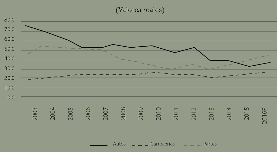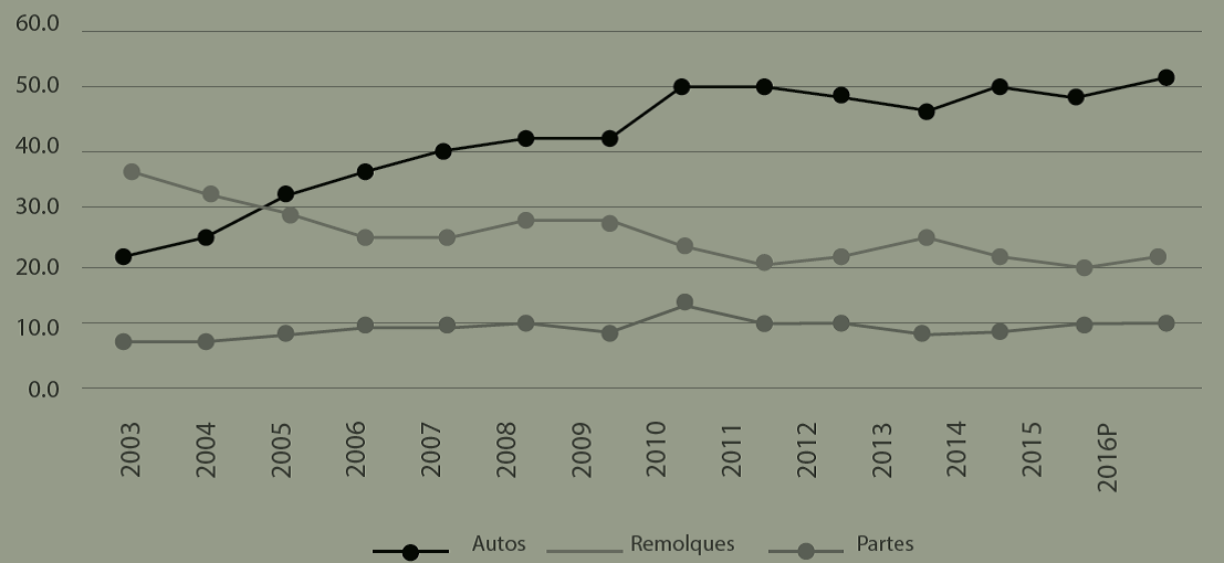 Estas tendencias en el uso de insumos se reflejan en la aportación de la IA a la producción total de va en la producción manufacturera que en promedio anual para el periodo 2003-2016 se ubica en 22.1% con variaciones significativas en las ramas. En la producción de vehículos este promedio es de 32.6% mientras que en la rama de auto partes es de 12.2%. Más relevantes son las tendencias que muestran estas ramas.