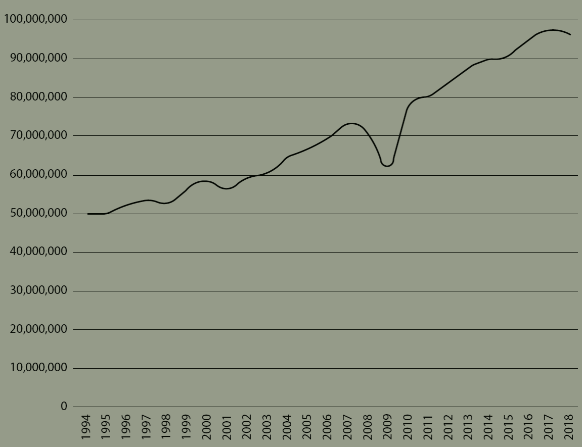 De acuerdo con datos de la Organisation Internationale des Constructeurs d’Automobiles (OICA), la producción mundial de automóviles (autos y vehículos comerciales) creció de 49.6 millones en 1994 a 95.6 millones en 2018, y registró una tasa media de crecimiento anual (TMCA) de 2.8 por ciento.7