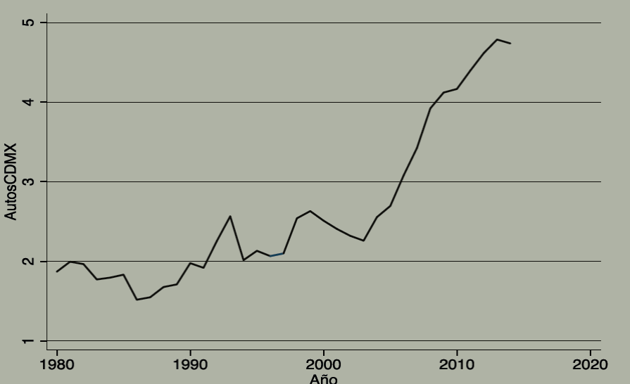 La política para regular la contaminación de ozono producida por vehículos automotores en la Ciudad de México en ningún momento determina o identifica el costo social que generan los usuarios de vehículos con motores de combustión interna, por lo tanto, en ningún momento propone un mecanismo que incentive a los agentes que generan la contaminación a que paguen el costo social de sus acciones. (que internalicen la externalidad que generan). Esta política tiene como único instrumento limitar la circulación de vehículos automotores de combustión interna independientemente del volumen de emisiones que generan. Pero la comparación de la Gráfica 2 con la Gráfica 5 sugiere que la política solo ha incentivado el aumento del parque vehicular de la Ciudad, aumento que ha sido probado por Eskeland, G. y Feyzioglu (1997), Davis (2008) y Gallego et al. (2013).