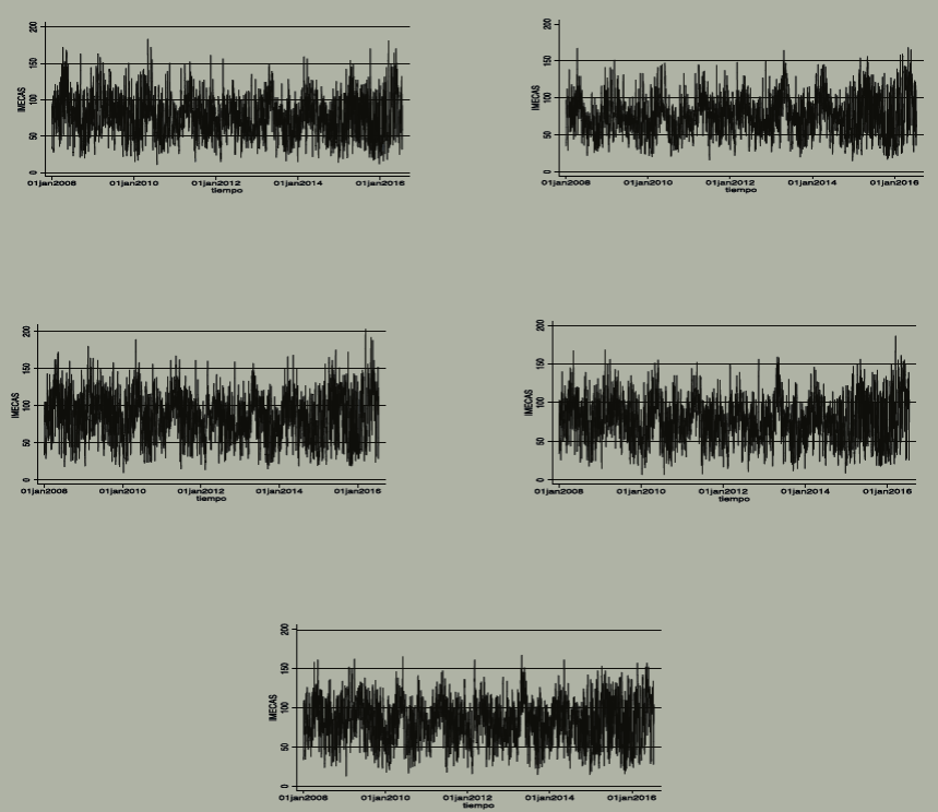 Al analizar las series de tiempo de ozono publicadas por la Secretaría del Medio Ambiente de la Ciudad de México se observa que las concentraciones máximas diarias de O3 registradas en cada uno de las cinco zonas de la ciudad (Noroeste, Noreste, Centro, Suroeste y Sureste) siguen un comportamiento estacionario, lo que significa que la política pública correspondiente no ha cambiado, ni puede cambiar su media ni su varianza en el largo plazo.