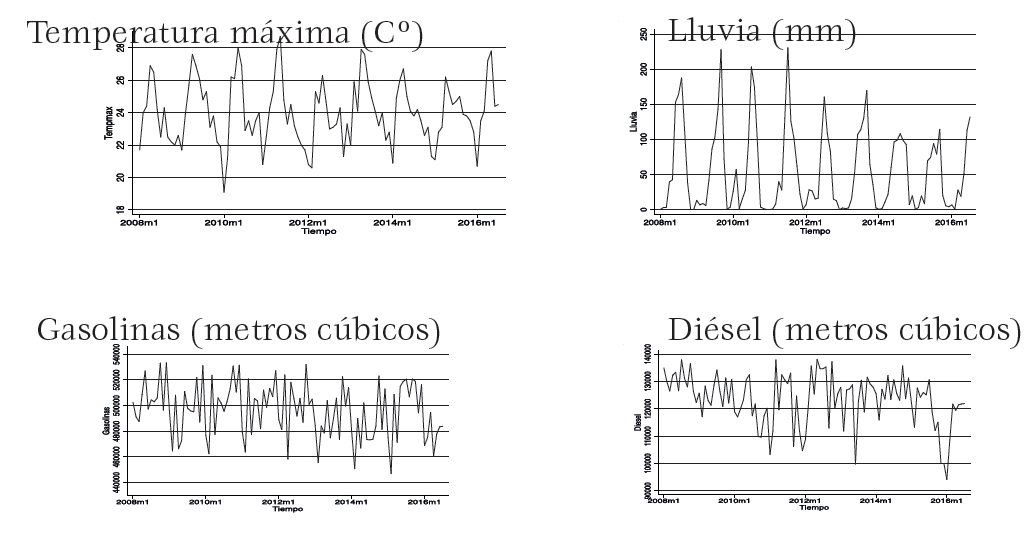 En cuanto a los determinantes del ozono, dado que la cantidad de contaminantes generada por los vehículos automotores no se establece por las mediciones del Programa de Verificación Vehicular, solo se mide su tasa como se explicó anteriormente, se utilizan los volúmenes de ventas de gasolinas y diésel para aproximar dicha contaminación. El número de autos registrado en la Ciudad no se utiliza porque no es posible determinar cuántos de los autos de los registrados circulan ni en que periodos lo hacen. Los datos del Sistema Estatal y Municipal de Bases de Datos (SIMBAD) del INEGI proporcionan el número de vehículos automotores registrados por Delegación Política más un rubro denominado “otros estados” que en el 2014 está vacío, lo que explica la caída de la cifra en ese año. Por otra parte, como se observa en la Gráfica 2, el número de autos registrados en la Ciudad presenta un importante crecimiento en el periodo de estudio, por lo que la prueba Dicky Fuller, que se realiza añadiendo un término de tendencia para esta variable, no proporciona evidencia para aceptar que esta serie sea estacionaria. En cuanto a los otros determinantes de la formación de ozono, condiciones del medio ambiente, se utilizan los promedios mensuales de la temperatura máxima en Cº y de la lluvia, medida en mm. La Gráfica 4 muestra que tanto la lluvia como la temperatura máxima, así como las ventas de gasolina y diésel presentan un comportamiento estacionario, es decir, su promedio y varianza son constantes en el tiempo. La Tabla 4 muestra los resultados correspondientes de la prueba Dicky Fuller.