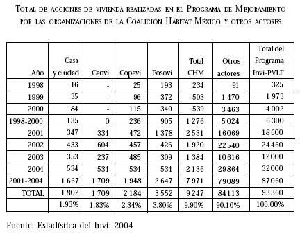 Aunque la participación de las organizaciones civiles que se ocupan de atender el problema de la vivienda y en general del hábitat,17 que han conformado una red que se conoce como la Coalición Hábitat México, participan en el Consejo de Desarrollo Social y han recibido recursos del programa de coinversión, su papel más destacado fue en el Consejo de Vivienda, espacio desde donde propusieron y conformaron el programa Cofinanciado de Mejoramiento de Vivienda (PMV).
