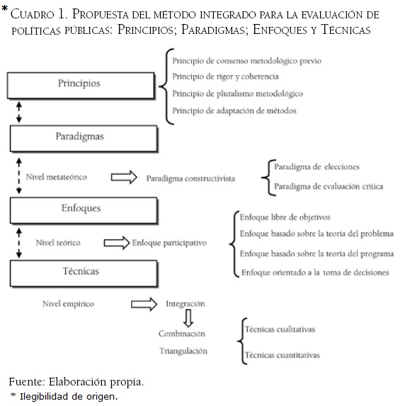 There is not a evaluation's methodology for analysis public policy agreed and widely accepted. This article propose, with the strict scientific rigor required, a methodological framework that can guide the analytical work of critical and constructive evaluation of the public interventions. So, it provides some useful theoretical insights from the epistemological framework to determine the principles, approach and method, as well as the choice of techniques and analytical tools that have to be part of, in practice, the mainstay of the evaluation processes of public policy.