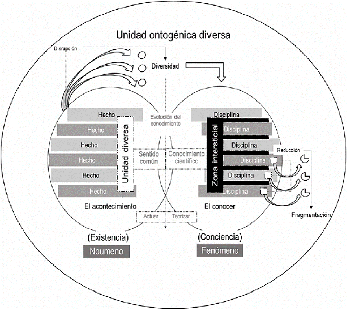La disrupción tiene un carácter ontogénico, pero se manifiesta en el orden epistémico: La unidad se manifiesta en diversidad en presencia de la disrupción y produce un correlato en la formación del campo disciplinar. La diversificación disciplinar sin embargo no logra cubrir el total de la realidad por una razón de definición estructural: las fronteras disciplinares se consolidan con la delimitación del objeto de estudio que cada investigación requiere para su ejecución. Afortunadamente con la formación de las fronteras disciplinares tiene lugar la configuración de una zona intersticial que permite el diálogo teorético.