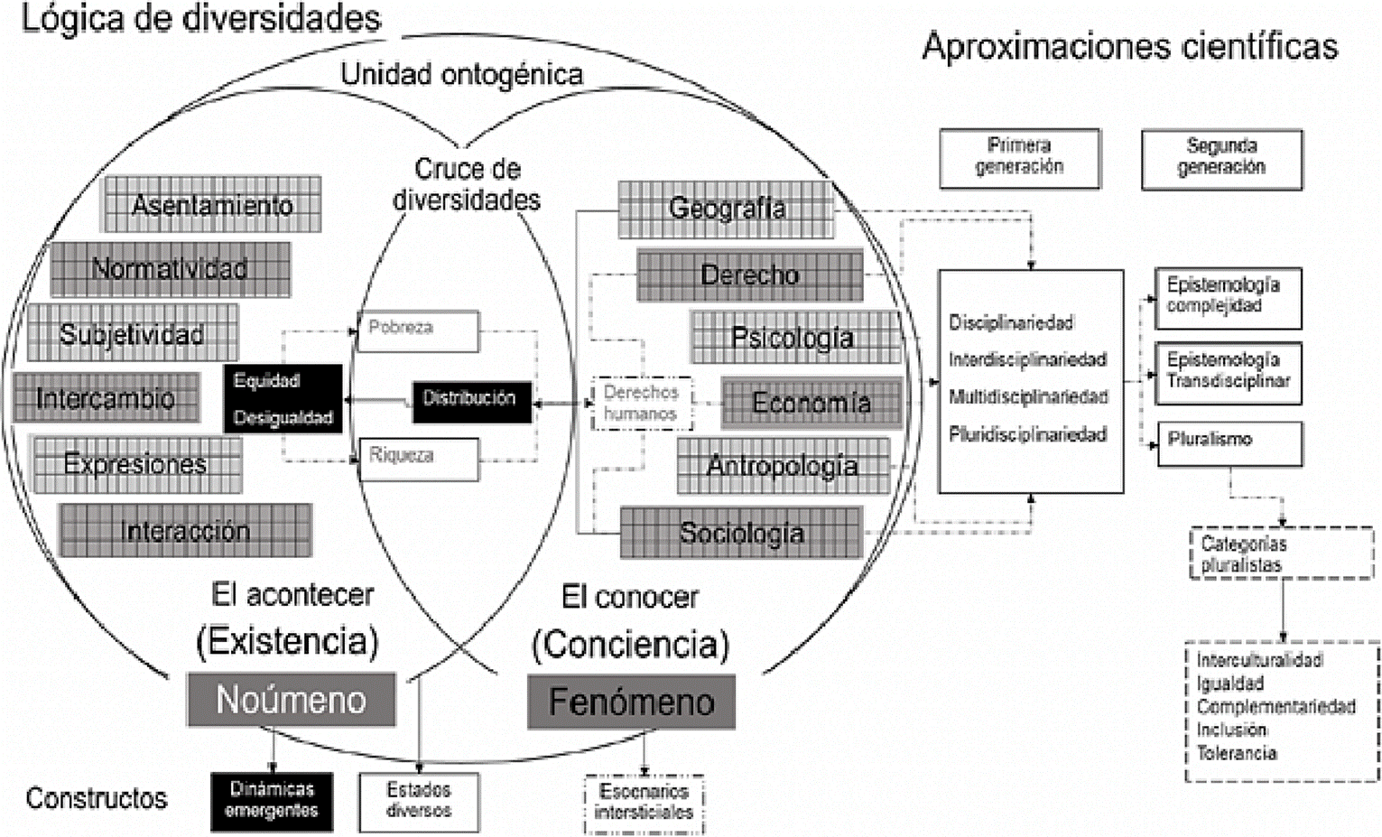 En la Fig. 3 se esquematiza la lógica de la diversidad del acontecimiento y su cruce con la diversidad epistémica. La co-incidencia entre ambas dinámicas da lugar a los estados diversos, como representaciones del espectro ontogénico, y a los escenarios intersticiales, como campos de saber emergentes. La lógica de las diversidades provee de una perspectiva que da al escenario académico su razón de ser y al escenario empírico una direccionalidad práctica en el telón de la pluralidad.