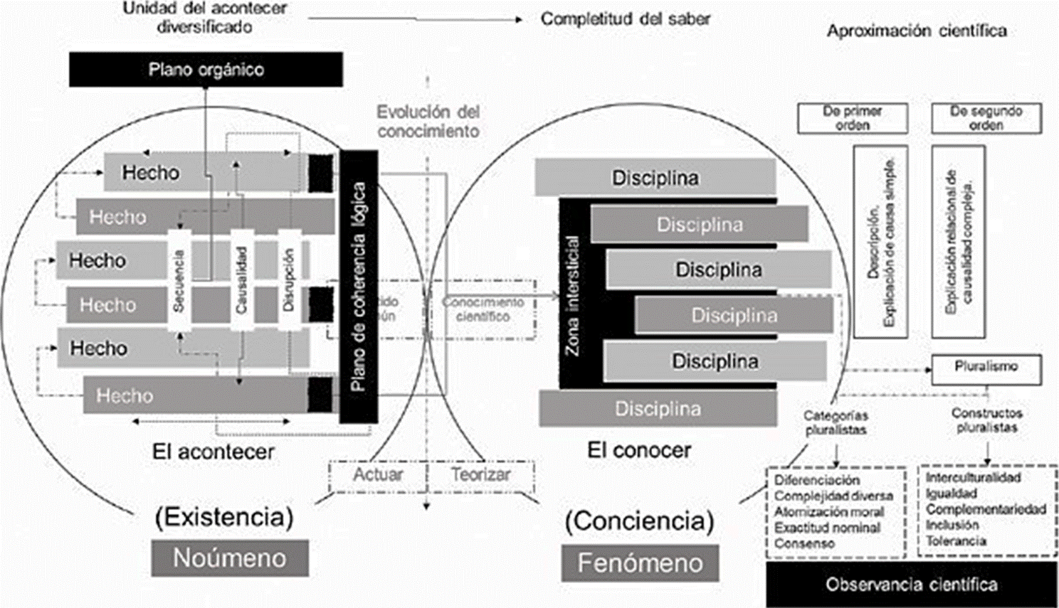 La articulación del plano orgánico con la coherencia lógica y la observancia científica es el pilar en el que la interacción subyacente al acontecer se sostiene por una lectura científica congruente con la unidad del acontecer diversificado, constituyéndose así el signo del pluralismo epistemológico.