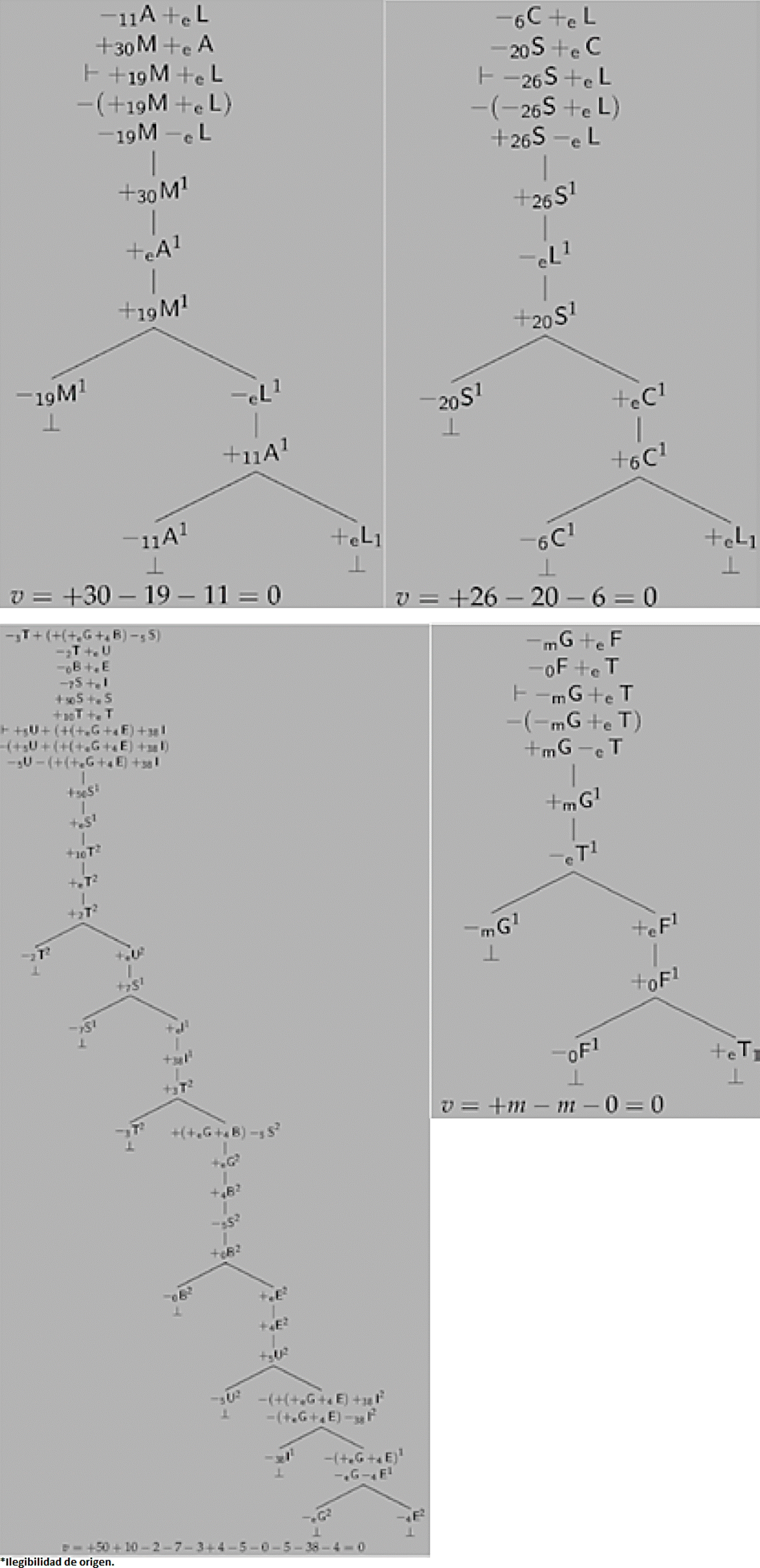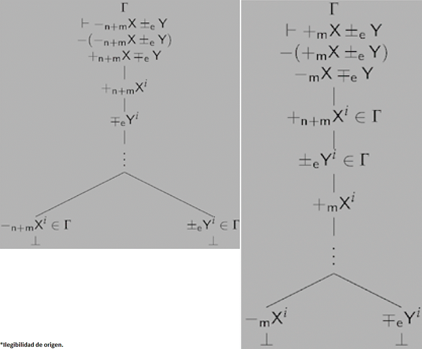 Supongamos, entonces, que tenemos una instancia del árbol del Diagrama 11 pero que su correspondiente inferencia no es válida, es decir, donde Γ+=Γ∪{+n+mX∓eY}, Γ+⊢⊥, pero la aplicación de las condiciones de inferencia de NTL a Γ no nos permite producir -n+mX±eY. Ahora bien, como el árbol del Diagrama 11 es completo, las puntas están cerradas, por lo que en nodos previos el árbol tiene que incluir algo de la forma -m+nX±eY o algo de la forma −mZ±eY y −nX+eZ, es decir, Γ={-m+nX±eY} o bien Γ={...,−mZ±eY, −nX+eZ, ...}. Pero si esto es así, en cualquiera de los dos casos, si aplicamos la condición i) a Γ obtenemos algo de la forma -X±eY, y no al revés, por la condición ii); y por último, por la condición iii) (a), la conclusión tiene que ser algo de la forma -m+nX±eY para que la suma de los valores numéricos sea igual a 0. Pero esto contradice la suposición de que no podemos construir una prueba de tal conclusión usando las condiciones de inferencia de NTL. Lo mismo ocurre, mutatis mutandis, para el árbol del Diagrama 12. Así, Γ={+mX±eY} o bien Γ={...,−nZ±eY, +m+nX+eZ, …}. En cualquiera de los dos casos, si aplicamos la condición i) a Γ obtenemos algo de la forma +mX±eY, y no al revés, por la condición ii); y por último, por la condición iii) (b), la conclusión tiene que ser algo de la forma +mX±eY. Pero esto contradice la suposición de que no podemos construir una prueba de tal conclusión usando las condiciones de inferencia de NTL.