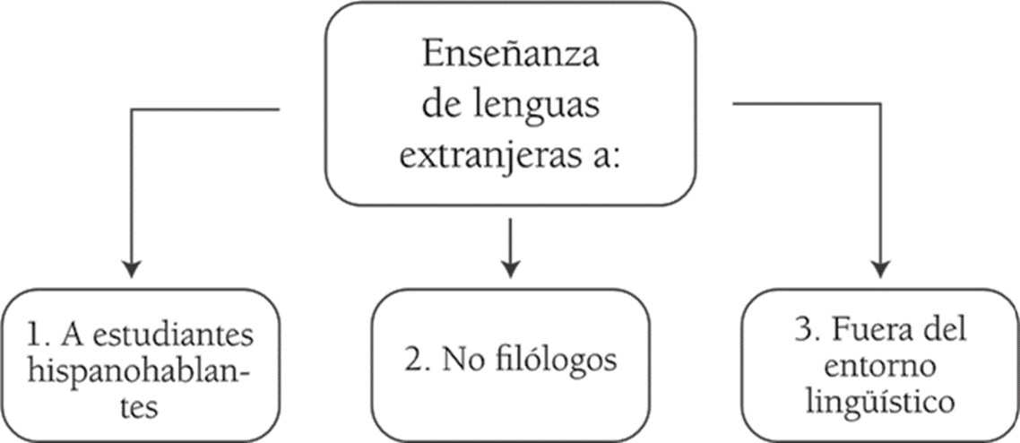 Uno de los problemas actuales de la metodología contemporánea de la enseñanza de lenguas extranjeras continúa siendo el problema de su enseñanza fuera del entorno lingüístico, es decir en un medio caracterizado por las particularidades linguo-metodológicas y culturológicas del país donde se enseña, aunque dicho problema ha sido discutido más de una vez en trabajos científicos y metodológicos (O. Bykova, I. Orekhova, L. Svirina, N. Fedotova). En particular, este problema trata de la metodología de la enseñanza de segundas lenguas a los estudiantes hispanohablantes que no se especializan en filología y que estudian un idioma extranjero en condiciones fuera del entorno lingüístico, o sea estando en su país natal. En esta última frase, se debe prestar atención a sus tres componentes: 1) «estudiantes hispanohablantes», 2) «no filólogos» y 3) «fuera del entorno lingüístico» (Gráfica 1).