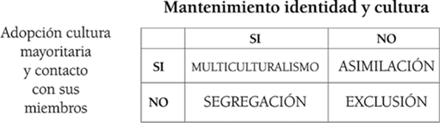 A partir del modelo de aculturación de Berry (1980, 1997), centrado en los procesos de aculturación del grupo minoritario -fenómeno psicosocial multidimensional reflejado en los cambios psicológicos que ocurren en los individuos como resultado de su encuentro con una cultura diferente-, surgieron otros modelos teóricos que incluían la perspectiva de los miembros de la sociedad mayoritaria y sus preferencias por el proceso de aculturación. Estos modelos influirán en determinar la conceptualización de las denominadas ideologías de la diversidad. Uno de éstos es el Modelo Interactivo de Aculturación (Bourhis et al., 1997), desde el que se plantea que si los miembros de la mayoría son partidarios de que el grupo minoritario mantenga su herencia cultural, así como de establecer relaciones con ellos y de que adopten pautas de la cultura de la sociedad de acogida, entonces abogarán por el multiculturalismo (o integración). Si son partidarios de una postura asimilacionista, no aceptarán que el grupo minoritario conserve sus pautas culturales de origen sino que preferirán la adaptación de éstos a la cultura mayoritaria. Si el grupo mayoritario no desea establecer relaciones con los miembros del grupo minoritario y quiere que se mantengan al margen de la sociedad manteniendo sus propias creencias y valores, optarán por la segregación. Por último, si los miembros de la sociedad mayoritaria son reacios al mantenimiento de las relaciones con los miembros del grupo minoritario y a que ellos formen parte de la sociedad de acogida, y además no están de acuerdo en que mantengan su herencia cultural, la postura resultante será la exclusión (véase Figura 1).