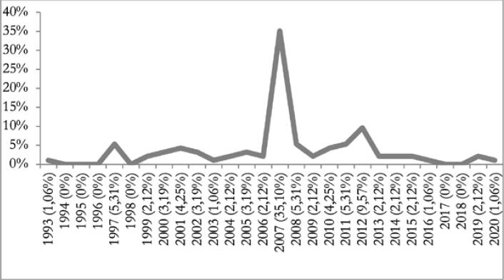 Para tener una visión amplia de los avances en torno al estudio de la corrupción judicial, elaboré una base de datos que incluye las publicaciones difundidas en formato de libro, capítulo de libro, artículo de revista académica, ponencia presentada en encuentro científico, informe de investigación, tesis de posgrado o cualquier otro medio de divulgación de esta naturaleza. A partir de una búsqueda detallada a través de la Internet capturé 94 documentos escritos en español e inglés entre 1993 y 2020. Un primer hallazgo es que el promedio anual de publicaciones es de 3,35. Como se observa en la Figura 1, los porcentajes por año están por debajo del promedio mientras que en 2007 hay un incremento considerable de investigaciones. De hecho, ese año concentra la tercera parte del total de la producción académica (35,10%).