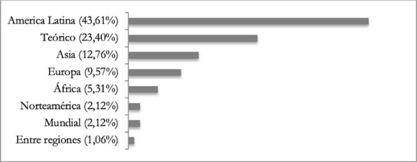 De otro lado, los datos presentados revelan que si bien los estudios sobre corrupción judicial cubren la mayoría de regiones geográficas, hay algunas en las que se ha concentrado la atención de los investigadores. De acuerdo con la Figura 2, América Latina es la región más analizada (43,61%), lo que resulta plenamente intuitivo si se considera que, acorde a mediciones de diferentes fuentes, en esta parte del mundo se identifican los mayores casos de corrupción judicial. A considerable distancia se encuentran los trabajos sobre Asia (12,76%) y Europa (9,57%). En cuanto a los países asiáticos, las investigaciones se refieren fundamentalmente a China. En lo relativo a Europa, los países que reportan más estudios son aquéllos ubicados en la región central y del este. África (5,31%) y Norteamérica (2,12%) presentan el menor porcentaje de investigaciones.