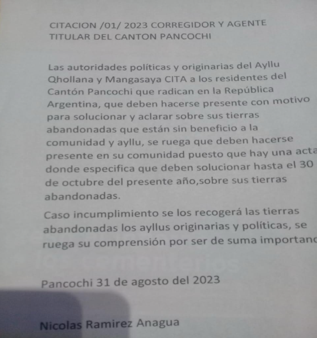 En el 2023, mientras hacíamos un programa en la radio de la Colectividad, vimos en una de las mesas del estudio la siguiente nota firmada por la autoridades políticas y comunales de Pancochi a los habitantes de Escobar provenientes de esa localidad: