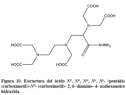 Recientemente se ha publicado la síntesis de nuevos derivados del DTPA en donde se mejoran las propiedades termodinámicas y cinéticas del BFCA así como la estabilidad in vivo del radiofármaco.9 Safavy y colaboradores81 en el 2002 sintetizaron el ácido N4, Nα, Nα, Nε, Nε- (pentakis (carboximetil))- N4-(carboximetil)- 2,6-diamino-4-azahexanoico hidrazida (Figura 10), el cual fue conjugado con una proteína (Mab Δ CH2HuCC49) para después ser marcado con 90Y para el tratamiento de cáncer de colon rectal.