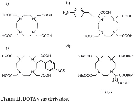 El agente quelante DOTA (Figura 11a)9junto con sus derivados (Figura 11a)9 son una buena alternativa que puede ser utilizada en lugar del DTPA, ya que los complejos metálicos de dicho compuesto han mostrado tener una liberación del radionúclido bajo condiciones fisiológicas.48 El DOTA forma complejos muy estables con una variedad de radionúclidos trivalentes, tales como 68Ga79, 90Y, 111In, 149Pm, 177Lu,84,85 y radionúclidos divalentes como 27Mg, 47Ca, 64Cu.86